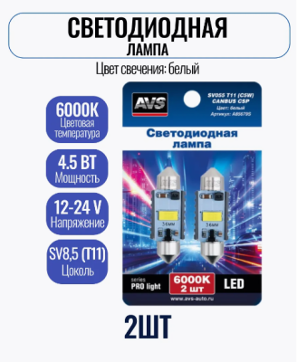 Светодиод AVS SV055 T11/белый/ (SV8,5) series PRO light CANBUS CSP 3570 36мм 12-24V., блистер 2 шт
