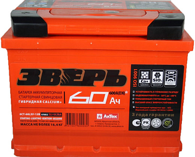 Аккумулятор ЗВЕРЬ 60 А/ч обратная R+ EN 650A 242x175x190 6СТ-60 LЗУ (R) 6СТ-60.0 /ЗВ 60-3-R /ZVK603R