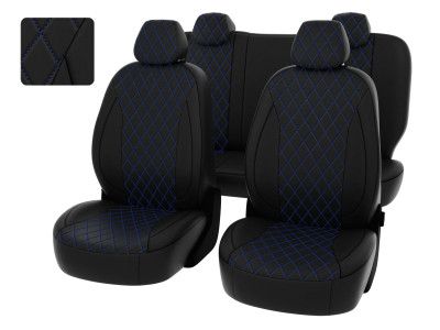 Чехлы Lada Granta I 2018-> Рестайлинг, Люкс, деленная спинка, РОМБ/отстрочка синяя, черная экокожа "