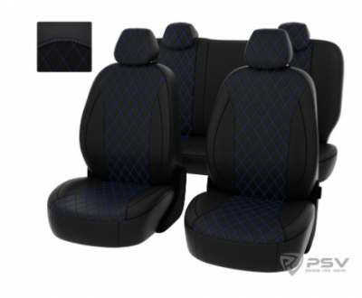 Чехлы VW Polo V 2009-2020 г. - Sd дел. РОМБ/отстрочка синяя, черная перфорированная экокожа "Статус"